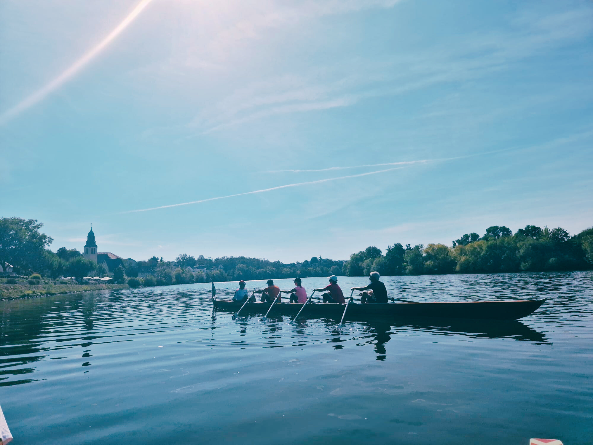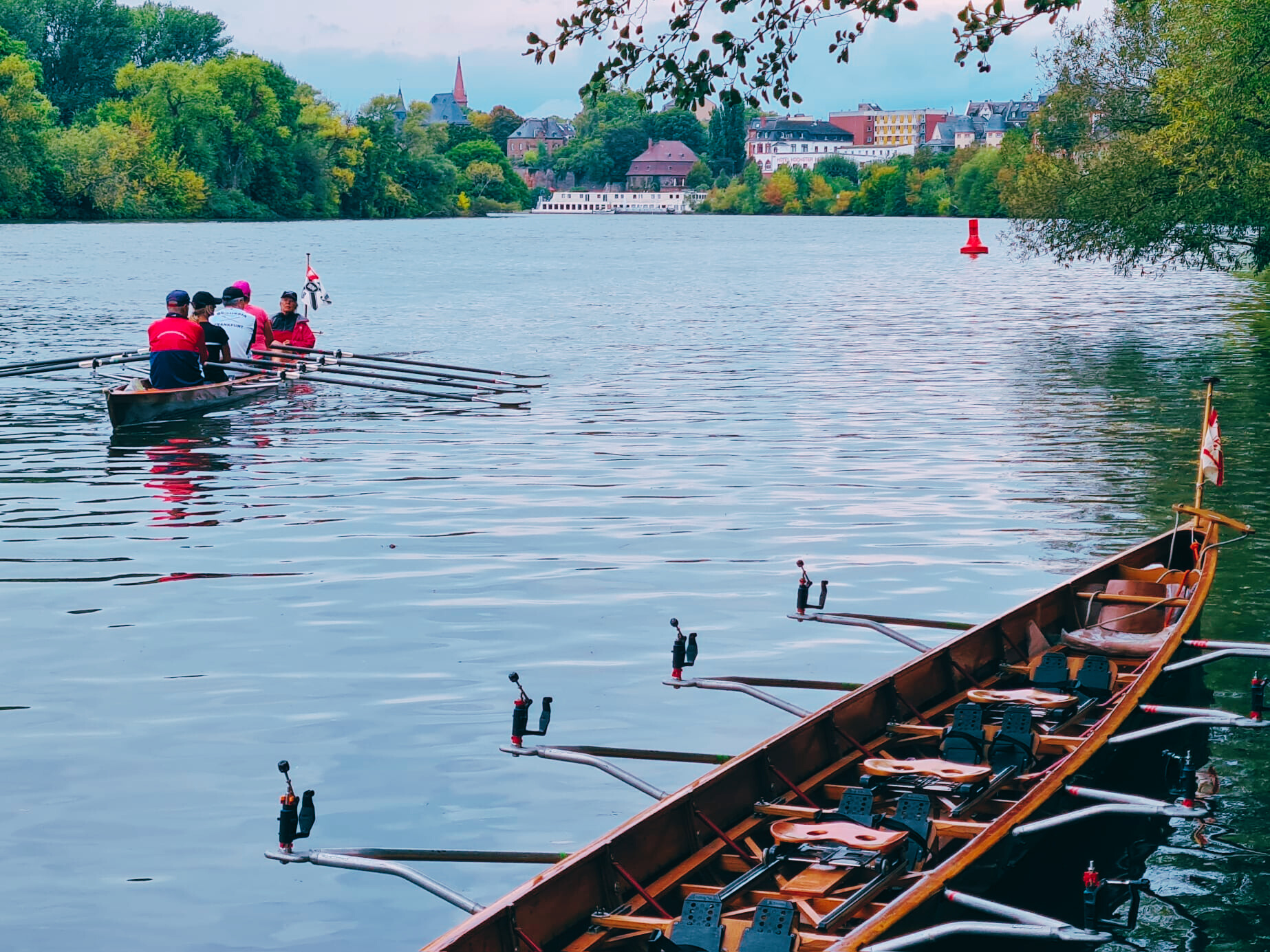 Am 20. und 21. September fand die Mini-Wanderfahrt Rüsselsheim–Frankfurt–Rüsselsheim statt, organisiert von Peter und Robert als Gemeinschaftsfahrt des Rüsselsheimer Ruder-Klubs (RRK) und der FRG Borussia. Dank Ulis Bustransfer starteten am Samstag zwei Vierer pünktlich um 9:30 Uhr vom Rüsselsheimer Ruder-Klub. In der „Plank“ saßen Michael und Astrid (RRK) sowie Jutta, Ulla und Walter (Borussia), in der „Kant“ Katrin und Wilfrid (RRK) sowie Robert, Adelheid und Peter (Borussia).